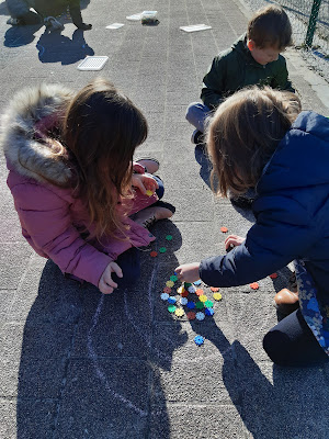 We gaan grotschilderijen maken op de stenen. Volgen van een patroon. Werken in kleine groepjes.